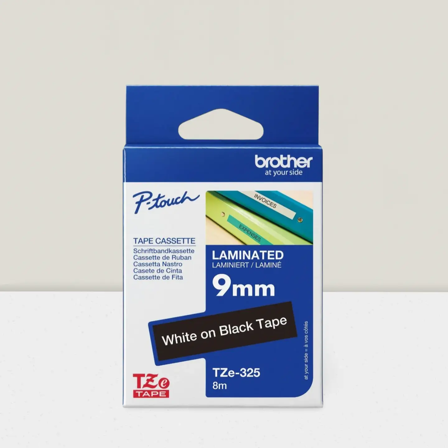 Brother TZE-325 WHITE ON BLACK laminated tape delivers crisp, durable labels ideal for dark surfaces. Its strong adhesive ensures long-lasting adhesion, while the laminated construction resists wear, smudging, and chemicals. Perfect for organization and identification in demanding environments.